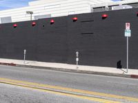 A vibrant cityscape in Los Angeles, California. The red lights on the black wall create an artistic ambiance in the art district. Urban design and architecture blend seamlessly with the clear sky and tree-lined streets.