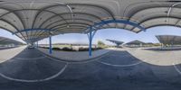 A captivating view of a parking lot in Los Angeles, California. The low concrete flooring is lined with blue metal arches, creating an urban design. The clear sky adds a touch of serenity to the bustling city life.
