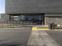 A modern office building in the heart of Los Angeles' business district. The sleek facade and concrete architecture blend seamlessly with the urban design of the city. Clear skies overhead illuminate the busy city life below.