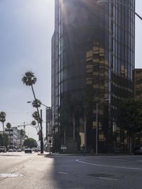 This is an image of a modern cityscape in Los Angeles, California. The tall skyscrapers and high-rise condominiums reflect the urban design and architecture of the city. The clear sky and bright sunshine create hard shadows on the road surface, buildings, and trees. The image captures the bustling business district of Los Angeles, with street lights visible in the daytime. This photo represents the vibrant and dynamic city life in California's largest city.