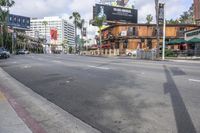 empty street in downtown with buildings and tall palm trees on either side of the road