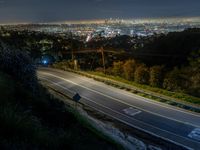 Aerial view of the nighttime cityscape of Los Angeles, California. The elevated Mulholland Road provides an overview of the modern architecture, urban infrastructure, and the city's skyline. The dark mountain backdrop adds to the dramatic scene.