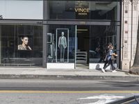 This image captures a snapshot of city life in Los Angeles, California. The photo shows a modern architecture building with storefront windows displaying clothing stores and dresses. People are seen walking on the sidewalk, and cars are parked along the curb. The vibrant urban design of the building and the busy crosswalk in front of it reflect the bustling city atmosphere. This photo was taken on Abbot Kinney Boulevard in Venice Beach, a popular shopping destination. It captures the essence of urban living in Los Angeles.