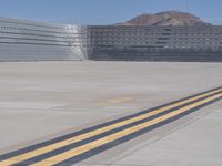 A bright yellow line on the runway at an airport in California, USA. The clear sky provides a stunning backdrop to the structure behind the line. An open space and concrete blastwall complete the landscape.