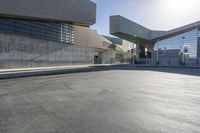 This image captures the modern architecture of a low-rise office building in Los Angeles, California. The city's urban design features concrete and asphalt roads lined with parking decks and garages. The open spaces are filled with a mix of composite flooring and soil, creating a harmonious blend of natural and man-made materials. The roof of the building stands out against the clear blue sky, while the walls showcase various surface textures. This photo represents the vibrant city life and the unique architectural style of Los Angeles.