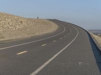 the curved road on a hillside is empty except for traffic to pass by and get to