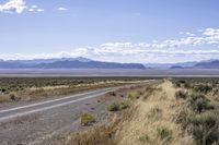 A scenic landscape in California, USA, featuring a rugged mountainous terrain with a clear sky and cumulus clouds. A dirt road winds through the grassy highlands, surrounded by desert vegetation.