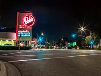 This image captures the vibrant cityscape of California, USA at night. The streets are lined with illuminated street lights and stoplights, creating a beautiful interplay of artificial light. The clear night sky provides a stunning backdrop for the city's skyline. The scene is a combination of residential areas, open spaces, and infrastructure. In the foreground, the asphalt road and curb lead the viewer's gaze towards a cozy cafe and a bustling restaurant. This photo showcases the city's lively atmosphere and offers a glimpse into the vibrant nightlife. It's the perfect representation of enjoying a midnight meal in California.