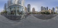 A 360-view of Los Angeles cityscape with modern architecture and a distorted perspective. The image captures the vibrant city life, with skyscrapers, residential areas, and a mix of classic and contemporary buildings. The clear sky adds to the beauty of this metropolis.
