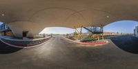 A modern architectural marvel in the heart of Los Angeles. The circular road structure stands tall against a clear sky, surrounded by residential and commercial buildings. Stairs lead to a vibrant urban space below.