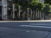 a black and white zebra crossing a street next to tall buildings with green trees on the other side