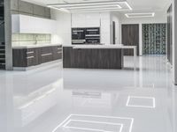 This image showcases a modern kitchen with a large center island in a beautiful home in Los Angeles, California. The open space and modern architecture of the building create a stunning interior design. The room features sleek concrete flooring and stylish furniture. The large center island provides ample space for meal preparation, while the bar at the center adds a touch of elegance. This property truly exemplifies the contemporary style of living in Los Angeles.