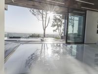 This photo captures a modern architecture building in Los Angeles, California, USA. The open-air covered structure features a spacious interior with floor-to-ceiling glass panels, allowing an abundance of natural light to flood the space. The sunlight reflects beautifully on the tiled floor, creating a bright and welcoming atmosphere. From this vantage point, one can see the stunning view of the garden and backyard of the property, further enhancing the connection between the indoor and outdoor spaces. This image showcases the seamless integration of interior design, architecture, and nature.