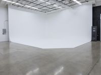 Spacious interior of a photo studio in Los Angeles, California. The open space is filled with natural light from the large windows. The minimalistic design features white walls and concrete flooring, creating a blank canvas for creative projects.