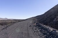 An empty dirt road in the California wilderness, winding between rocky terrains with trees in between. The rugged landscape and clear sky create a scenic view. Explore the geology and open spaces of California.