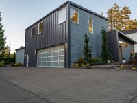 This image captures a modern residential villa in California, USA. The house is surrounded by lush vegetation and tall trees, with a clear sky above. The villa features large windows and wooden fixtures, adding to its contemporary architecture. A concrete road leads up to the driveway and entry of the property. The dawn light enhances the beauty of this home, showcasing its modern design against the natural landscape. This photo represents the blend of nature and modern living in California.