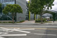 This image captures the essence of urban life in Los Angeles, California. The modern architecture of office buildings lines the city streets, while residential areas provide a glimpse into the everyday lives of its residents. The cloudy and gloomy grey sky creates a moody atmosphere, contrasting with the vibrant city life below. The asphalt roads and crosswalks showcase the city's infrastructure and accessibility. Overall, this photo encapsulates the bustling business district and urban design of Los Angeles.