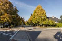 A picturesque suburban road in Kelowna, British Columbia. Lined with deciduous trees displaying vibrant autumn colors. Classic architecture and public spaces provide shade for pedestrians. The tranquil Okanagan Valley forms the backdrop.