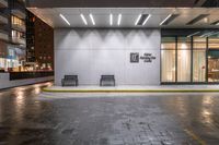 two benches outside of an office building in the rain at night time with a door open on both sides