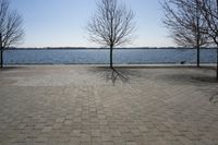 This is an image of a coastal landscape in Ontario, Canada. The photograph captures the serene beauty of the open space with water and trees. The horizon blends seamlessly with the clear sky, while clouds gently float above. A road surface leads towards a pier and jetty, reflecting in the calm waters of a lake or river. The winter season adds a touch of frost to the branches and woody plants, creating a peaceful atmosphere. This photo represents a peaceful morning in Toronto, showcasing the stunning natural scenery and tranquility of the area.