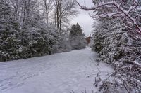 This is an image of a gloomy dawn in a forest landscape in Ontario, Canada. The snow-covered road leads through the dense forest, with trees and vegetation covered in snow. The evergreen trees provide a stark contrast against the freezing temperatures and the grey sky. The sunlight peeks through the clouds, casting a soft glow on the snow-covered ground. This photo represents the serene beauty of nature in Ontario, with its off-road tracks and snowy slopes. It captures the essence of a gloomy winter day in the Toronto area.
