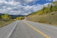 This is a scenic landscape photo taken in Alberta, Canada. The image captures a winding asphalt road surrounded by lush green forests, towering mountains, and vast grassy plains. The clear blue sky with fluffy clouds adds to the beauty of the natural environment. The road surface appears smooth and well-maintained, leading through a diverse vegetation including trees, flowers, and dense forests. The landscape showcases the picturesque highlands and slopes of Alberta, making it a perfect destination for nature enthusiasts. This photo represents the breathtaking beauty of Canada's natural landscapes.