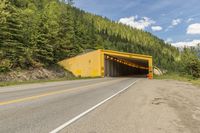 A picturesque landscape in Canada, featuring a winding asphalt road surrounded by majestic mountains and dense forests. The clear blue sky and fluffy clouds enhance the natural beauty. Road surface reflects sunlight, blending with the lush vegetation.