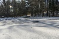 This is an image of a snowy landscape in Canada. The photo showcases a forest with snow-covered trees and branches. A road runs through the open space, leading the viewer's eye into the natural environment. The winter sunlight filters through the branches, casting beautiful shadows on the road surface. The vegetation, covered in frost, adds to the feeling of freezing temperatures. The clear sky above highlights the beauty of the winter scene. This photo was taken in Toronto, capturing the essence of a typical winter day in Canada's largest city.