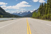 An elevated view of a straight road in Canada, surrounded by lush forest and mountainous landscapes. The road surface is made of asphalt, leading to a low river with clear skies above. A perfect day to explore the natural beauty of British Columbia and Alberta.
