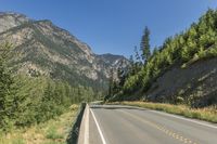 An asphalt road winds through the picturesque landscape of British Columbia, Canada. Towering mountains and lush forests surround the highland road. Clear skies highlight the natural beauty of the vegetation-covered slopes. Welcome to Lillooet!