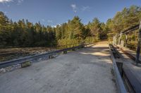 A picturesque view of a road in Ontario, Canada. The road cuts through the beautiful highland landscape, surrounded by lush vegetation and towering trees. A clear blue sky with fluffy white clouds adds to the scenic beauty.