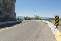 A scenic coastal road in British Columbia, Canada. The road winds through the mountains, with breathtaking views of the ocean and Okanagan Lake. Clear skies, lush landscape, and the sound of crashing waves create a perfect day for a drive in Kelowna's Okanagan Valley.