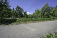 An empty road in Toronto, Ontario, lined with lush green trees and bushes. The clear sky contrasts with the vibrant nature of the landscape. A tree branch rests on the curb, adding to the serene atmosphere.