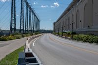 This is an image taken from straight down the road in Canada. The asphalt surface is lined with Armco barriers and guard rails, providing safety. The skyline of Toronto can be seen in the distance, while clouds add depth to the sky. The image also features the curb and a museum off to the side. This photo captures a typical day in Canada, showcasing the infrastructure and surroundings of a road in Niagara Falls, with Toronto just visible in the background.