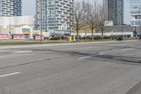 A quiet day in downtown Toronto, Ontario. Modern architecture lines the city streets with high-rise condominiums and office buildings. Clear sky contrasts with the bustling business district below.