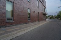 The dawn breaks in Toronto, Canada. An urban art district with red brick buildings and black doors. A side walk lined with wood and asphalt leads to the vibrant city