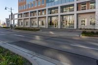 A typical urban residential area in Ontario, Canada. The clear sky casts hard shadows on the suburban neighborhood. Residential buildings line the asphalt road, with street lights illuminating the area. A perfect day in Toronto.