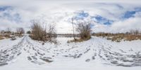 A winter landscape in Markham, Ontario. The straight road leads to a frozen lake surrounded by snowy fields. Footprints in the snow add a touch of humanity to the wilderness. The fish eye lens captures the beauty of the natural environment.