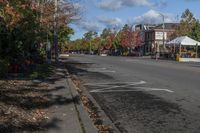 a street with an intersection marked out for pedestrians and some leaves are strewn on the ground