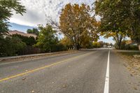 the long empty road is surrounded by trees and yellow leaves in the fall season of the year
