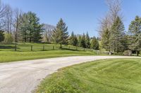This beautiful photo captures a scenic road in Ontario, Canada. The asphalt road winds through lush green grass and trees, with sunlight filtering through the leaves. A wooden guard rail and split rail fence border the road, leading the way to a picturesque farm in the distance. The photo showcases the natural environment and landscape of Ontario, with the city of Toronto in the background.