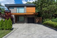 A straight road in a suburban neighborhood in Ontario, Canada. Lush green grass and trees line the surface. Cloudy sky sets the backdrop for a typical day in Toronto. Residential houses and courtyard visible in the POV.
