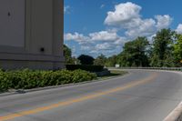 This photo captures an empty asphalt road in Canada, with trees lining the sides and no cars in sight. The road surface is clear and well-maintained, providing a smooth and safe path for travel. In the distance, the recognizable skyline of Toronto can be seen, along with the iconic Niagara Falls. The clear blue sky above is scattered with fluffy clouds, adding a touch of beauty to the scene. This image represents a peaceful day in Canada, where nature and infrastructure coexist harmoniously.
