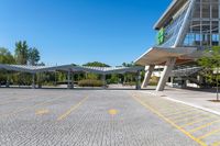 This image captures an empty parking lot in Toronto, Canada. The clear blue skies above and open space create a peaceful atmosphere. The low-rise buildings in the background provide a sense of urban surroundings. This photo represents a sunny day in the city, where the parking deck offers plenty of room for vehicles. The straight road leading into the parking deck invites visitors. It's a perfect image to showcase urban landscape and parking infrastructure in Toronto.