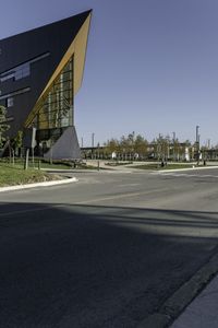 This image captures a modern cityscape in Toronto, Canada. In the foreground, a traffic light stands at a busy intersection, with a school arrow sign pointing towards a building. The clear sky above highlights the urban architecture, showcasing the mix of residential and office buildings. The asphalt road surface leads to the financial district, symbolizing city life and business. The urban design reflects the modernity of Toronto, with its sleek and stylish structures. This photo represents a typical day in the bustling and vibrant city of Toronto.
