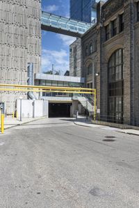 A modern office building in the business district of Toronto, Canada. The straight road lined with urban design elements leads to the building's street entrance. Yellow factory buildings, cloud-filled sky, and bustling city life complete the scene.