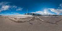 a fish eye view of an empty area with no people around it and snow on the ground