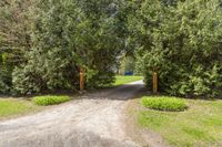 A lush green landscape in Ontario, Canada. The winding road curves through the beautiful scenery, lined with trees and shrubs. The asphalt thoroughfare leads to a peaceful driveway entrance, surrounded by nature.