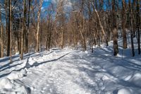 the dirt pathway through the woods and snow is full of footprints and small trees under a bright blue sky