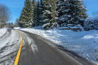 This image captures a suburban road in Ontario, Canada, covered with snow and surrounded by evergreen trees. The clear sky above contrasts with the white snow on the ground. The residential area is visible on the side, indicating the peaceful and quiet nature of the suburb. The road extends along the side of a hill, providing a picturesque view. This photo represents a typical winter day in Toronto, Ontario.